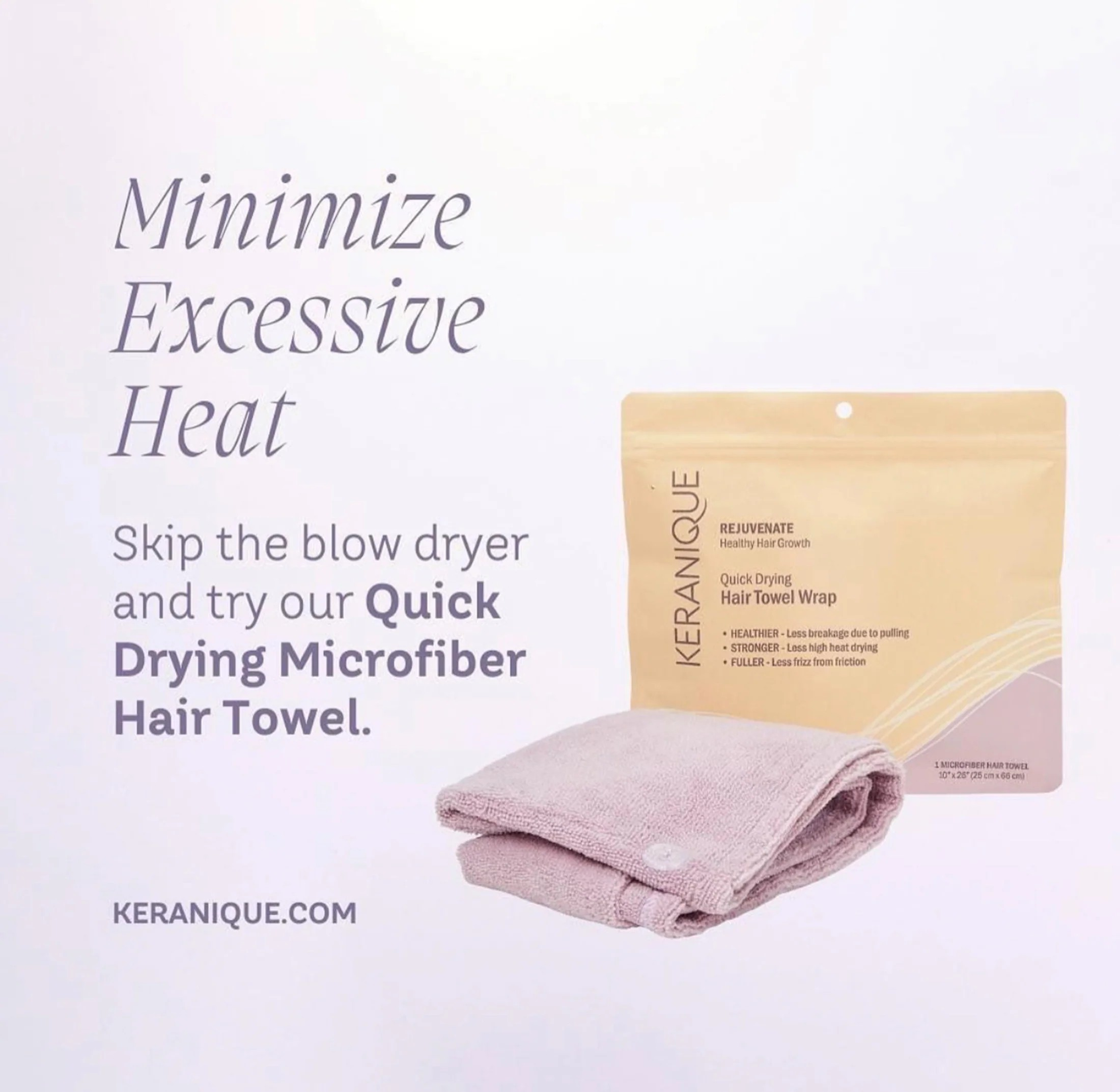 Squeeze excess water from your hair, then use the Keranique Hair Towel to gently press, blot and release. Scoop your hair into the towel and secure in place. Wear as long as you want - the longer you wear it the more it will naturally dry out hair.