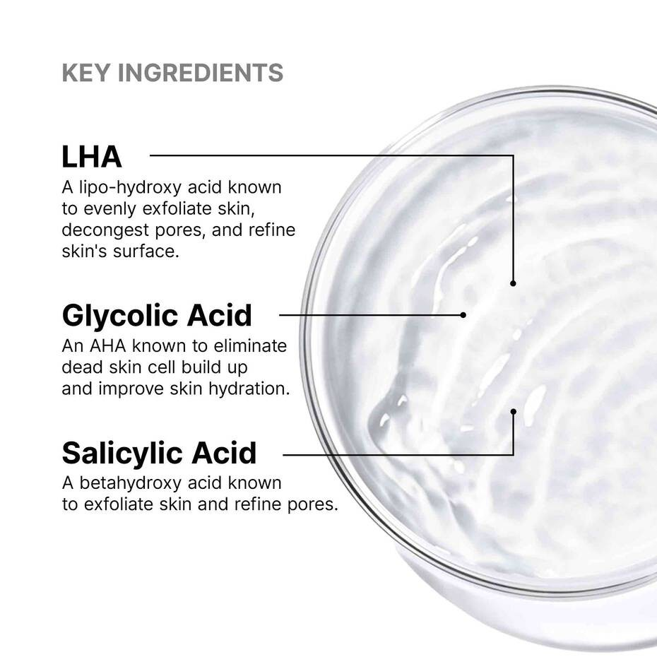 Glycolic acid toner to help unclog pores and remove surface dead skin cells with lipo-hydroxy acid.